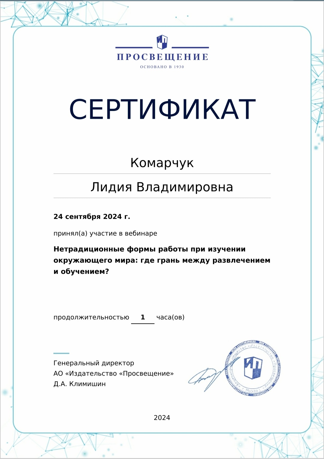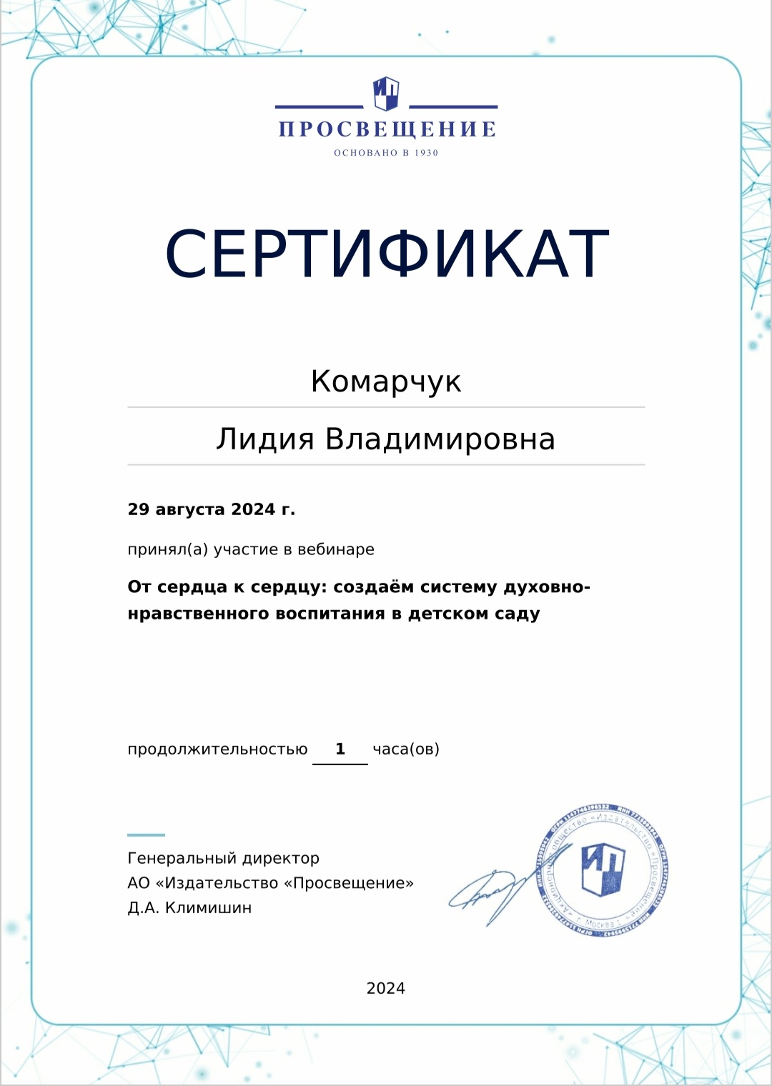 Сертификат участника вебинара "От сердца к сердцу: создаем систему духовно-нравственного воспитания в детском саду"