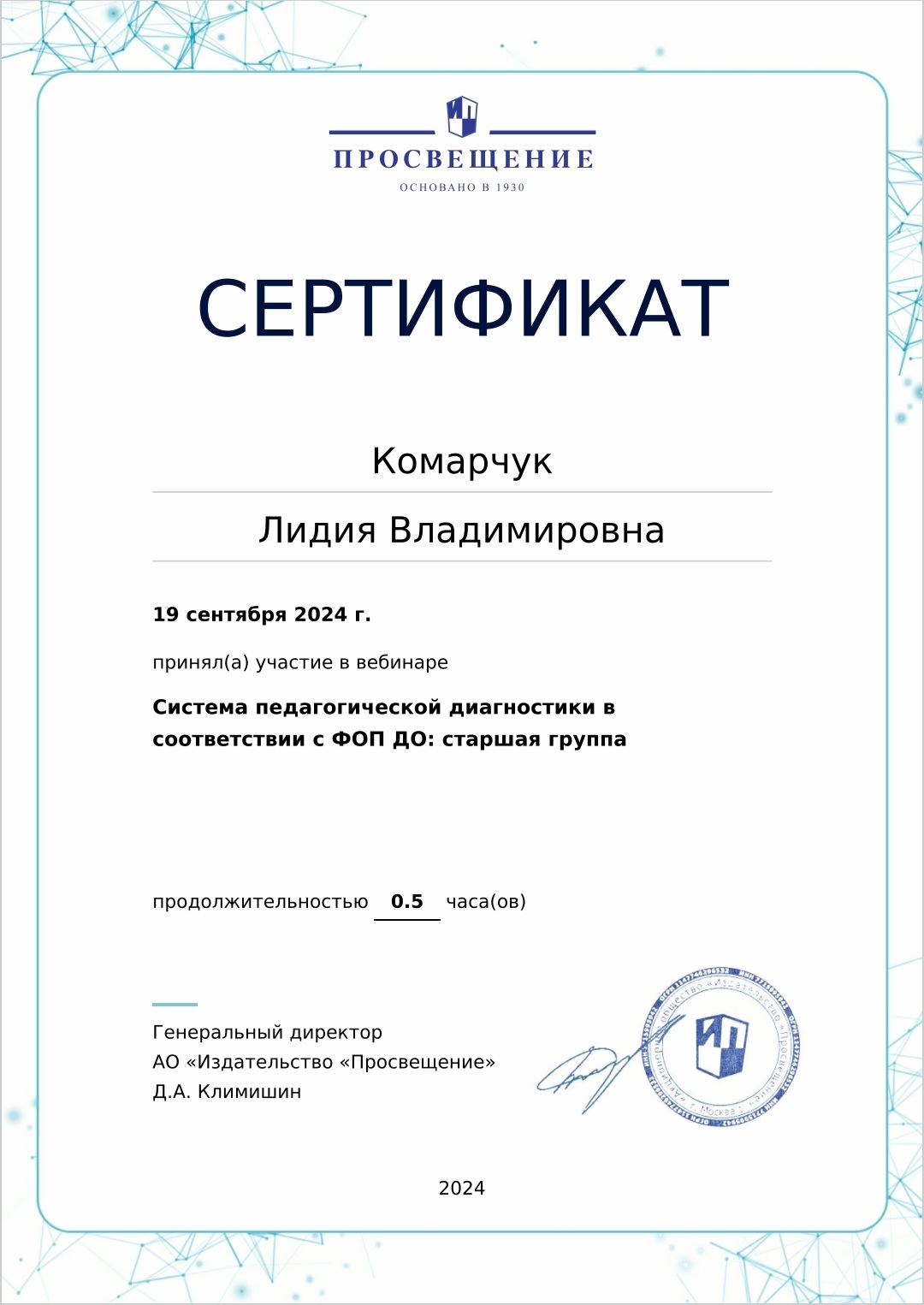 Сертификат участника вебинара "Система педагогической диагностики в соответствии с ФОП ДО:подготовительная к школе группа"
