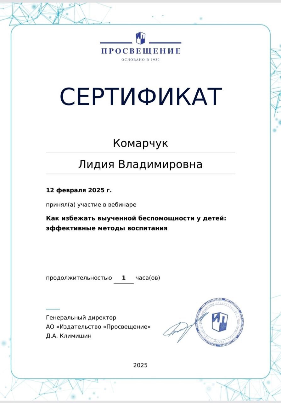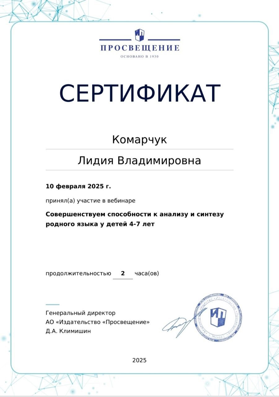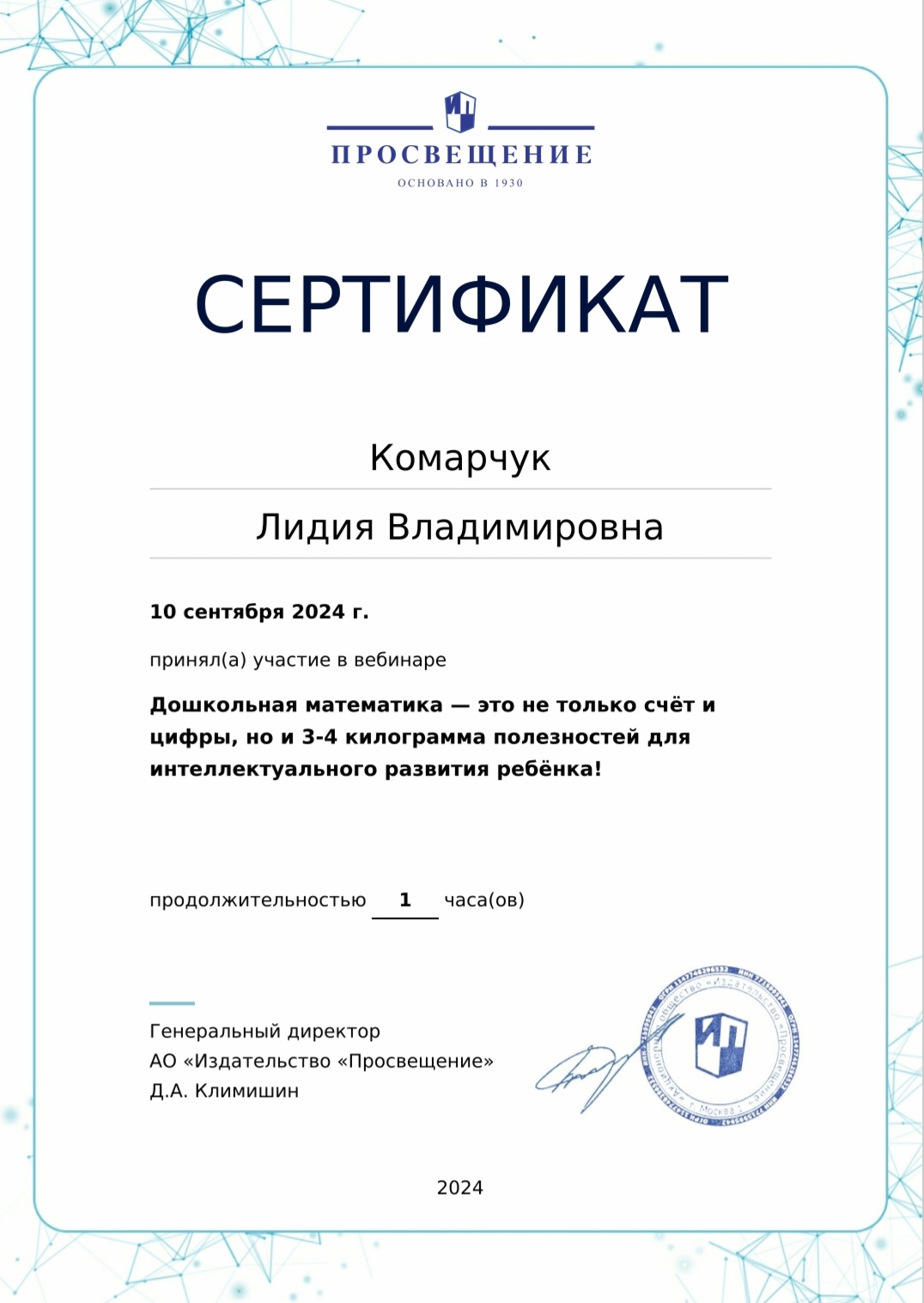 Сертификат участника вебинара "Дошкольная математика - это не только счет и цифры, но и 3-4 килограмма полезностей для интеллектуального развития ребенка"