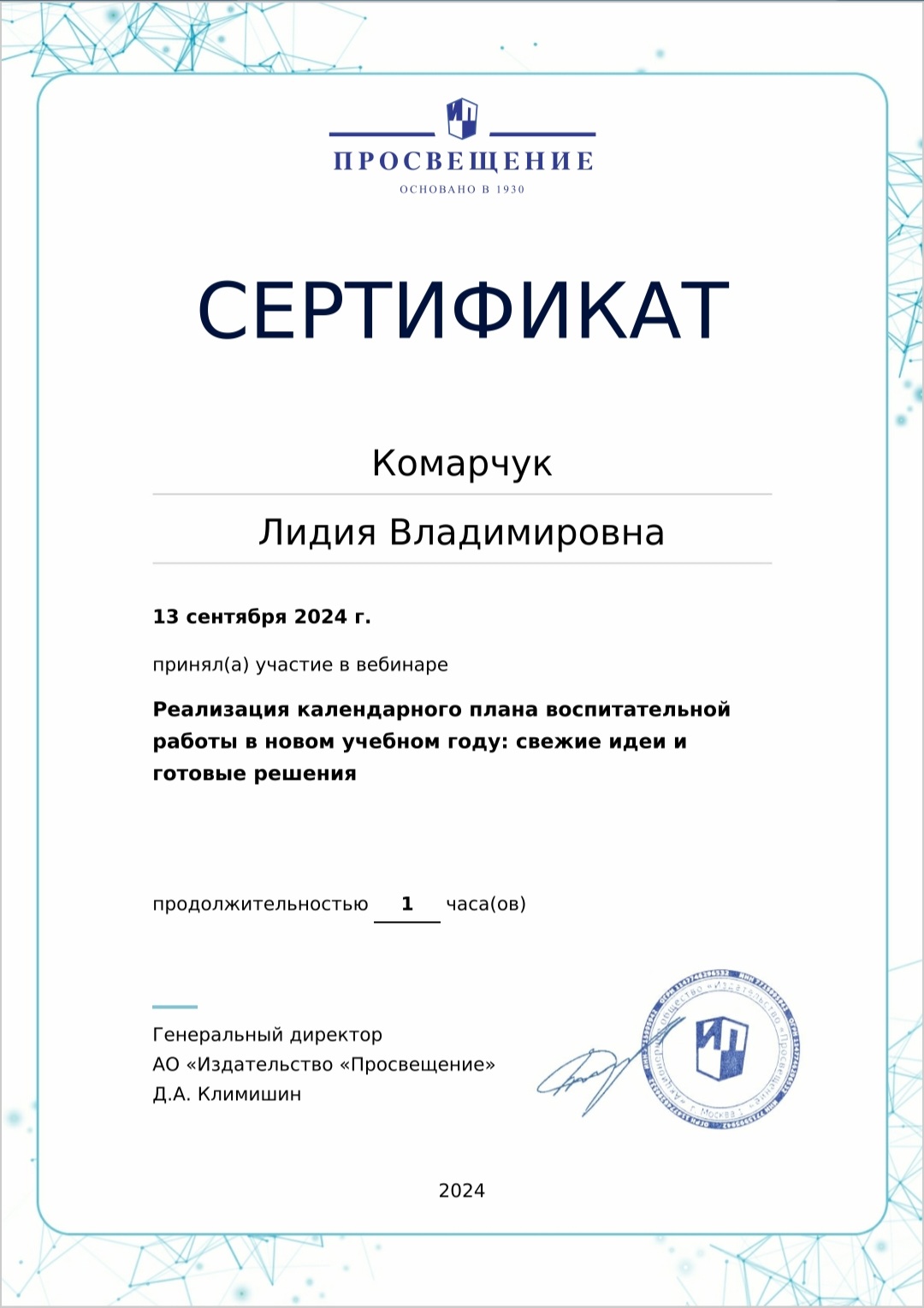 Сертификат участника вебинара "Реализация календарного плана воспитательной работы в новом учебном году"