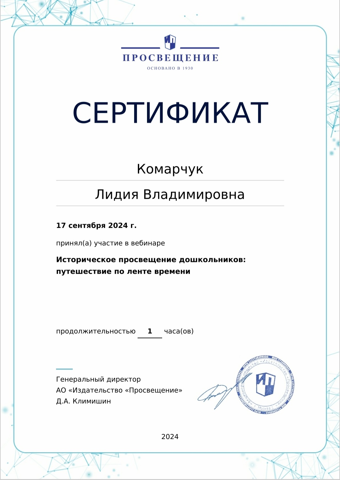 Сертификат участника вебинара "Историческое просвещение дошкольников: путешествие по ленте времени"