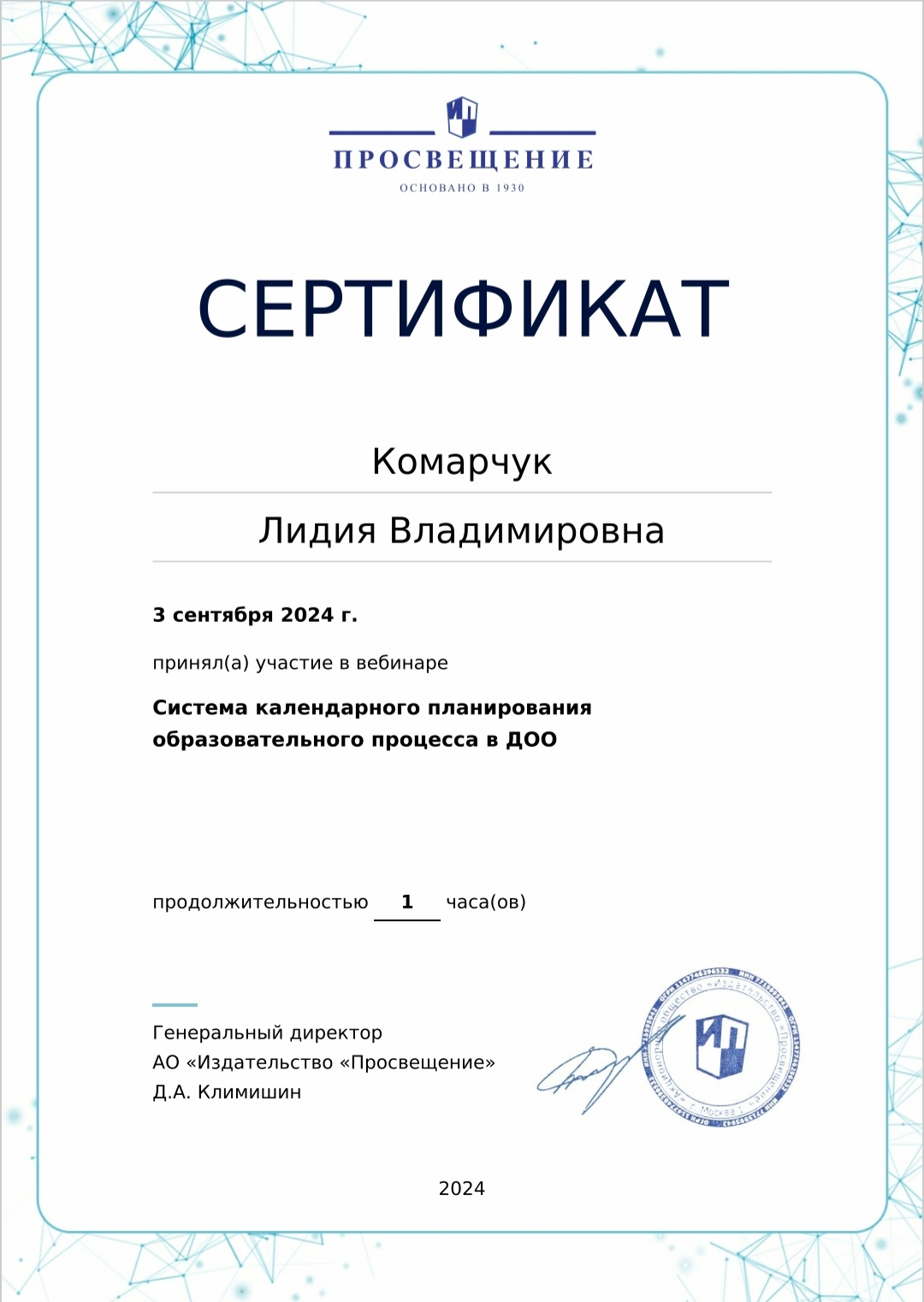 Сертификат участника вебинара "Система календарного планирования образовательного процесса в ДОО"