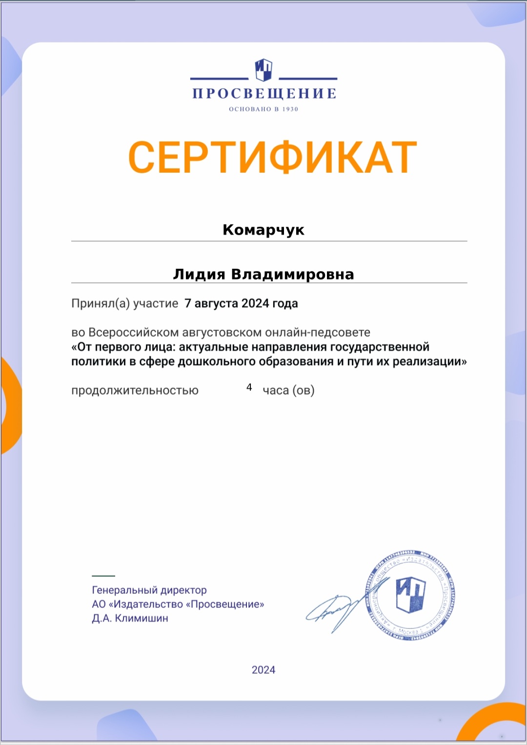 Сертификат участника Всероссийского августовского онлайн-педсовета "От первого лица: актуальные направления государственной политики в сфере дошкольного образования и пути их реализации"